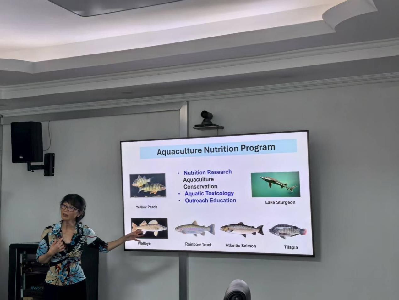 報告會上,黑龍江所魚類營養與飼料研究室劉紅柏研究員、王常安副研究員率先發言,圍繞鮭鱒養殖領域的核心需求,系統分享了團隊在鮭鱒營養需求解析、高效飼料配方優化等方向的階段性研究進展與實踐成果。隨后,鄧東方教授結合自身多年的研究積累,從魚類基礎營養需求、水產飼料替代原料開發、功能性飼料添加劑應用、飼料投喂策略等方面,系統地闡述了當前國際魚類營養與飼料配方優化的前沿研究動態。報告中,鄧東方教授不僅展示了多項研究成果,也分享了在技術轉化、產業應用過程中的寶貴經驗與獨到見解,為參會人員帶來了國際化的科研視野與創新思路。